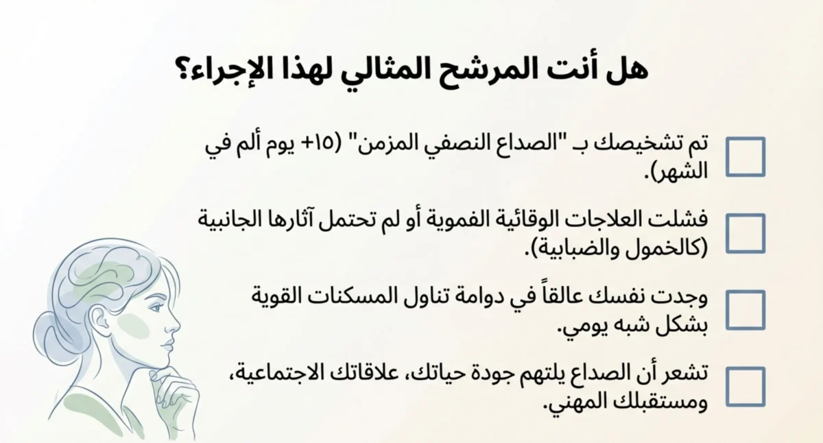 من خلال تجربتي مع البوتكس للصداع لا يُعد البوتكس خياراً عشوائياً أو علاجاً أولياً لنوبات الصداع العارضة الناتجة عن الإجهاد أو قلة النوم. بل هو بروتوكول علاجي متقدم مخصص لمن استنفدوا الحلول التقليدية. يُنصح بـ حقن البوتوكس للصداع المزمن بشكل أساسي في الحالات التالية: